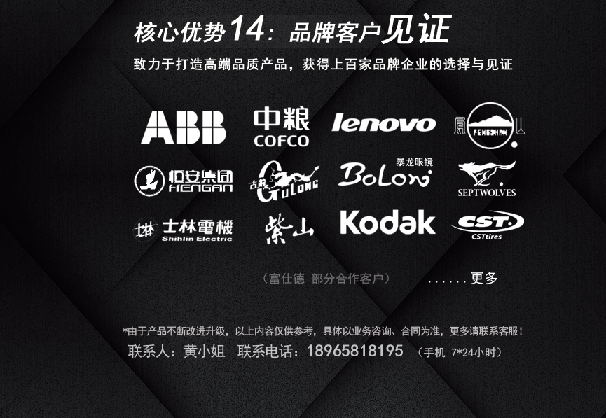 聯(lián)想、ABB、九牧、 萬利達、CST、古龍罐頭、七匹狼、 正浩食品、紫山、中糧、宏發(fā)股份、暴龍眼鏡、士林電機、海堤、恒安、冠林、路達國際、海晟連鎖、鳳山安溪鉄觀音、正新輪胎、圣莉雅壁紙、百得(廈門)等。