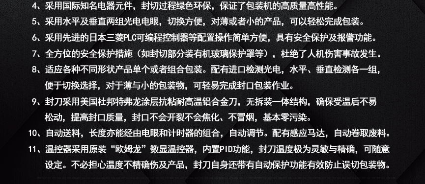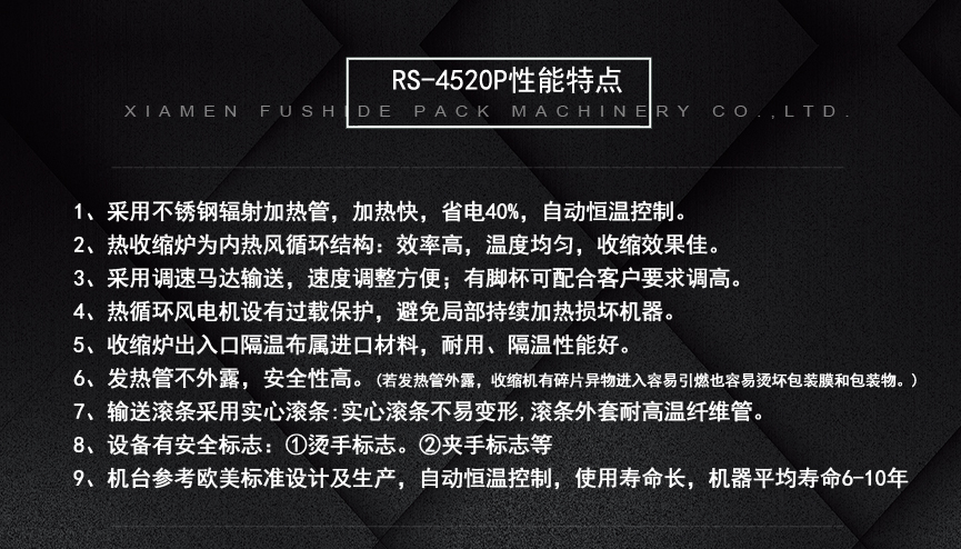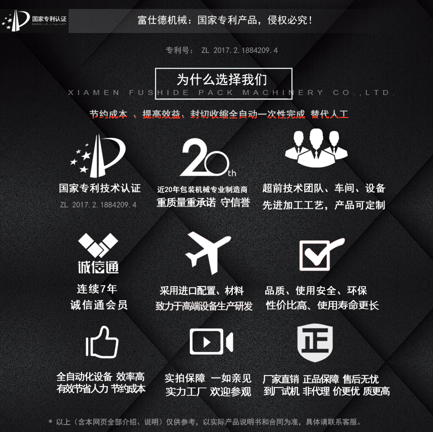 擁有多項專利技術(shù) 數(shù)千平標準廠房 批量標準化生產(chǎn) 可定制開發(fā)和自動化流水線搭建! 超前技術(shù)團隊 先進加工工藝 高精度加工設(shè)備 近20年專業(yè)研發(fā)經(jīng)驗不斷改進、創(chuàng)新、突破!我們定位于專注做中高端全自動熱收縮膜包裝機,請不要拿我們和不同定位的廠家對比!我們是源頭工廠…